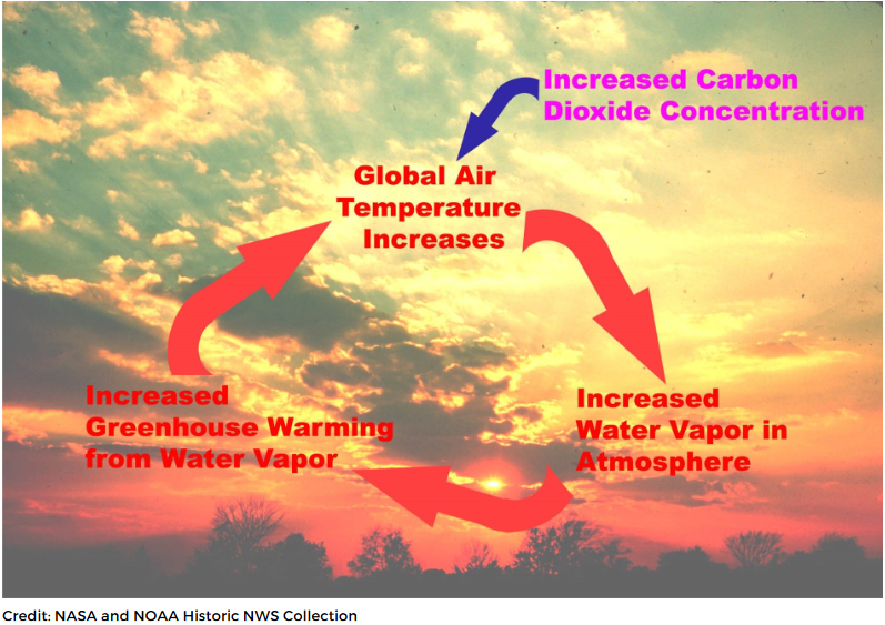 Since warmer air retains more moisture, the rise of the earth’s temperature leads to more vapour in the air, retaining more heat. And thus, a positive feedback loop is created. The loop is presented in the diagram below.